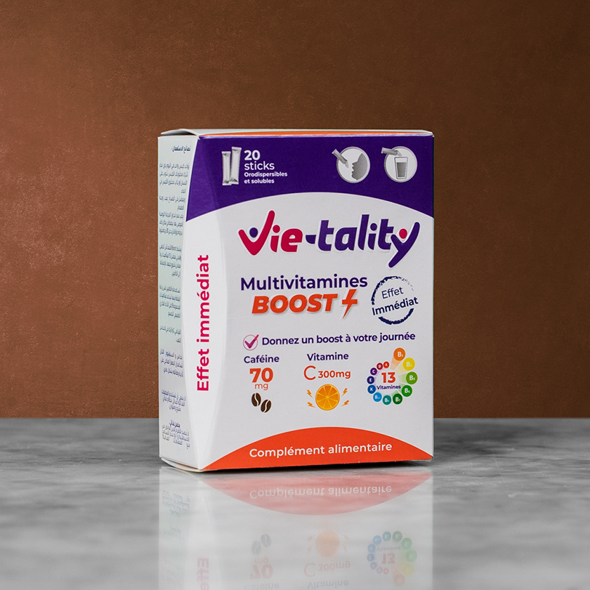 Multivitamines Boost + a un effet coup de fouet au niveau mental et physique grâce à la caféine qu’il contient en plus de ses 13 vitamines et 3 minéraux, La caféine aide à augmenter la vigilance, les vitamines du groupe B contribuent au maintien des performances intellectuelles normales de l’organisme La vitamine C et le zinc contribuent à réduire la fatigue.